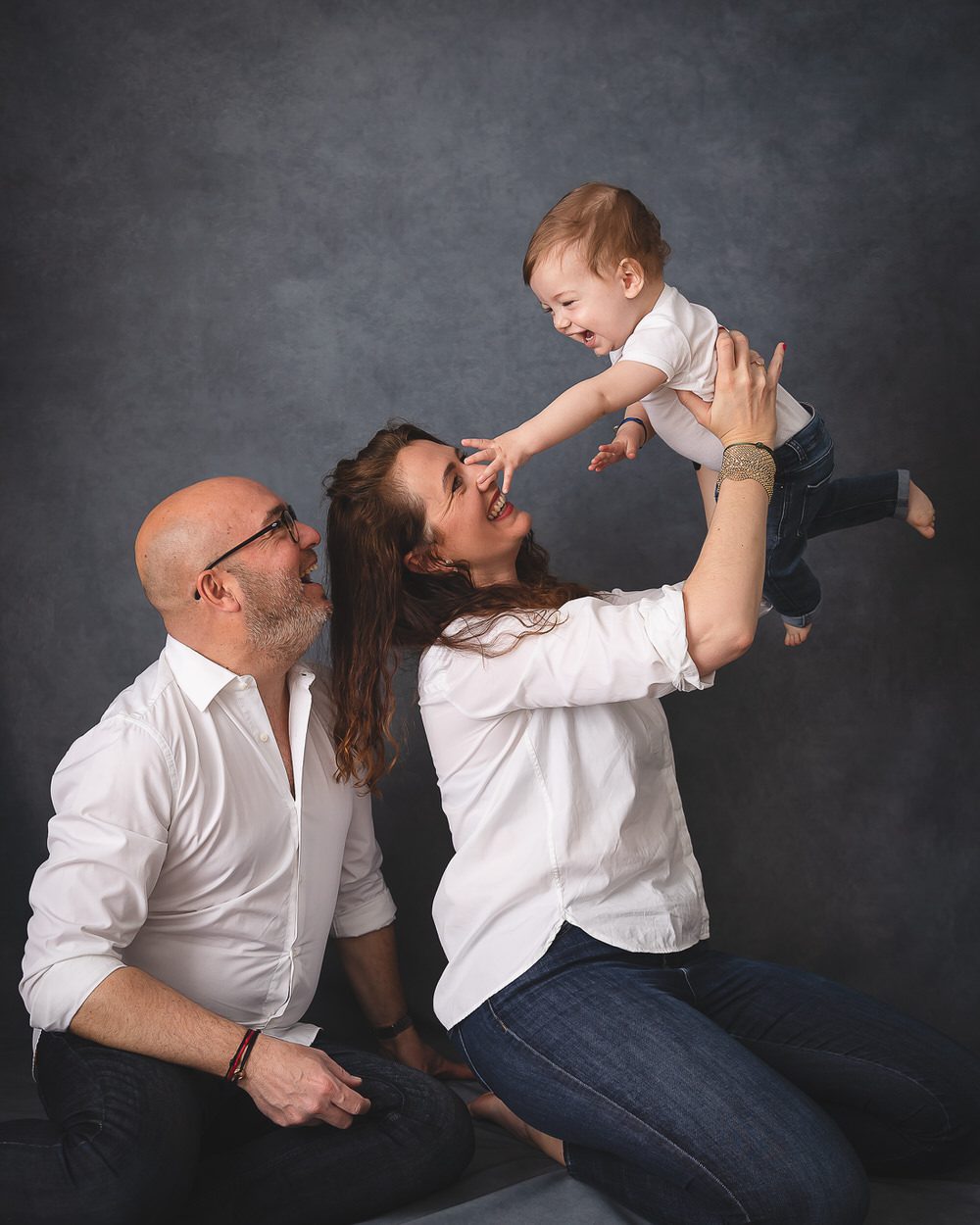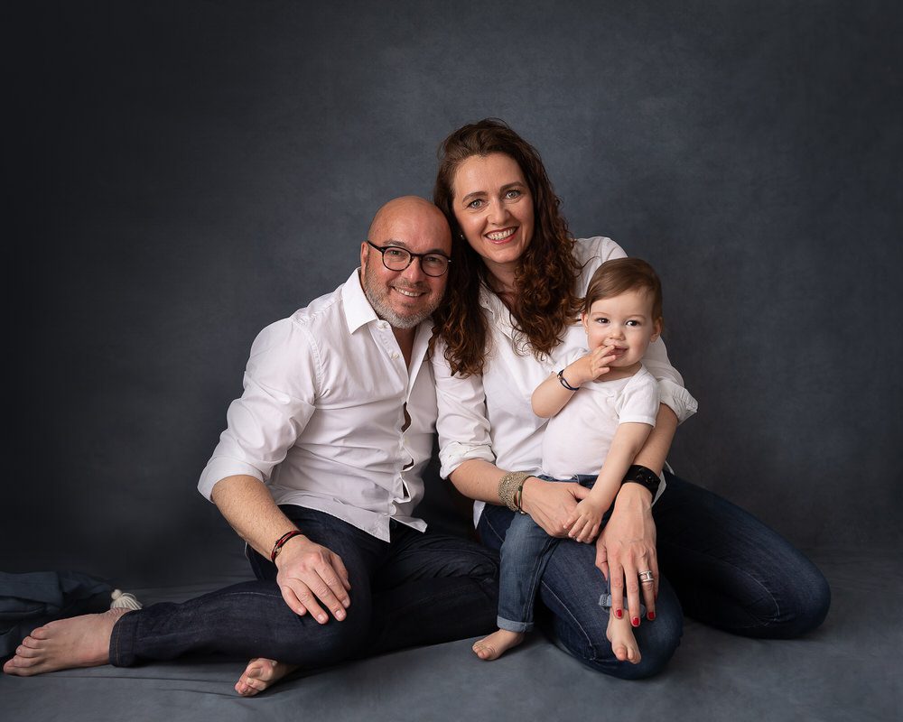 Les photos avec les parents font également partie intégrante de la séance. Et là encore, vous pouvez choisir le fond qui vous convient le mieux. Ici, les parents de ce grand bébé ont choisi le fond gris foncé texturé.